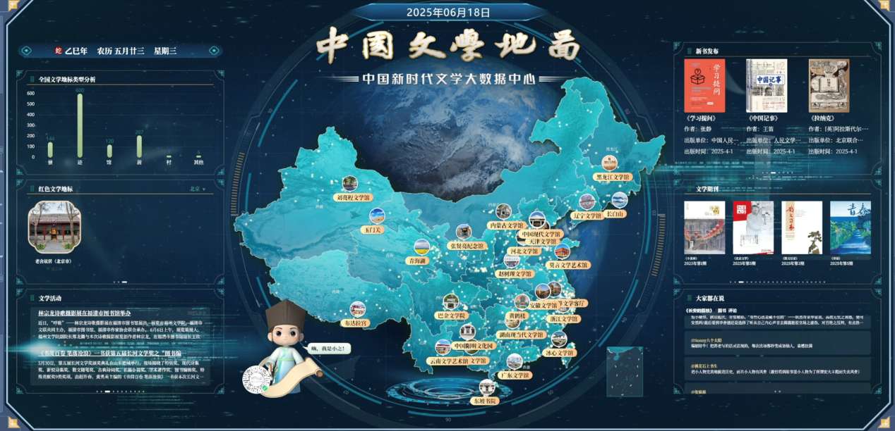 据介绍,中国文学地图是中国新时代文学大数据中心“标准、数据、平台、应用、安全”五大体系中的平台级应用。目前,地图上共标注了文学地标1148个,其中包括文学场馆124个、名人故居218个、书店书屋20个、文学相关景区158个、文学相关遗迹628个,覆盖全国各地。在“大数据+人工智能”双轮驱动的技术思路下,中国文学地图接入全国首个文学智能体,呈现出数据丰富、可持续生长、应用可挂载迭代等特点,是一张智能化的文学地图。